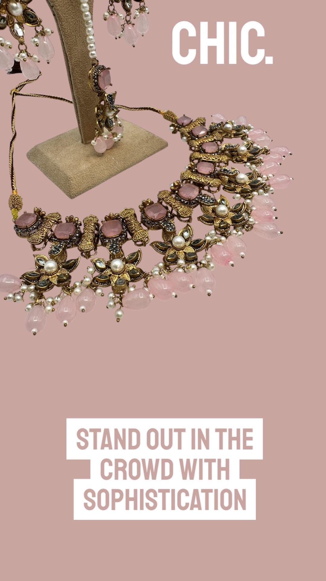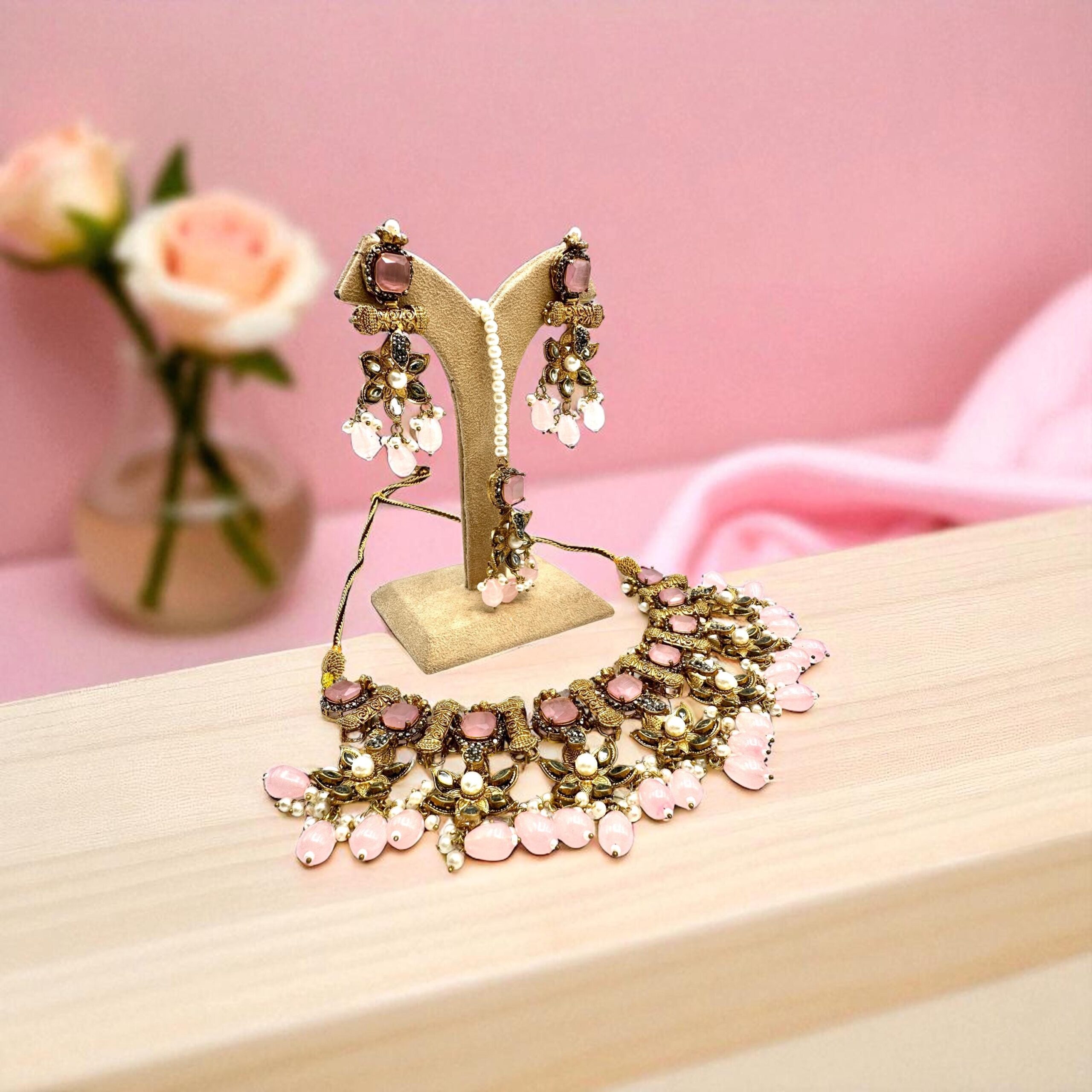 Bollywood ethnic Indian designer necklace set antique gold finish soft pink