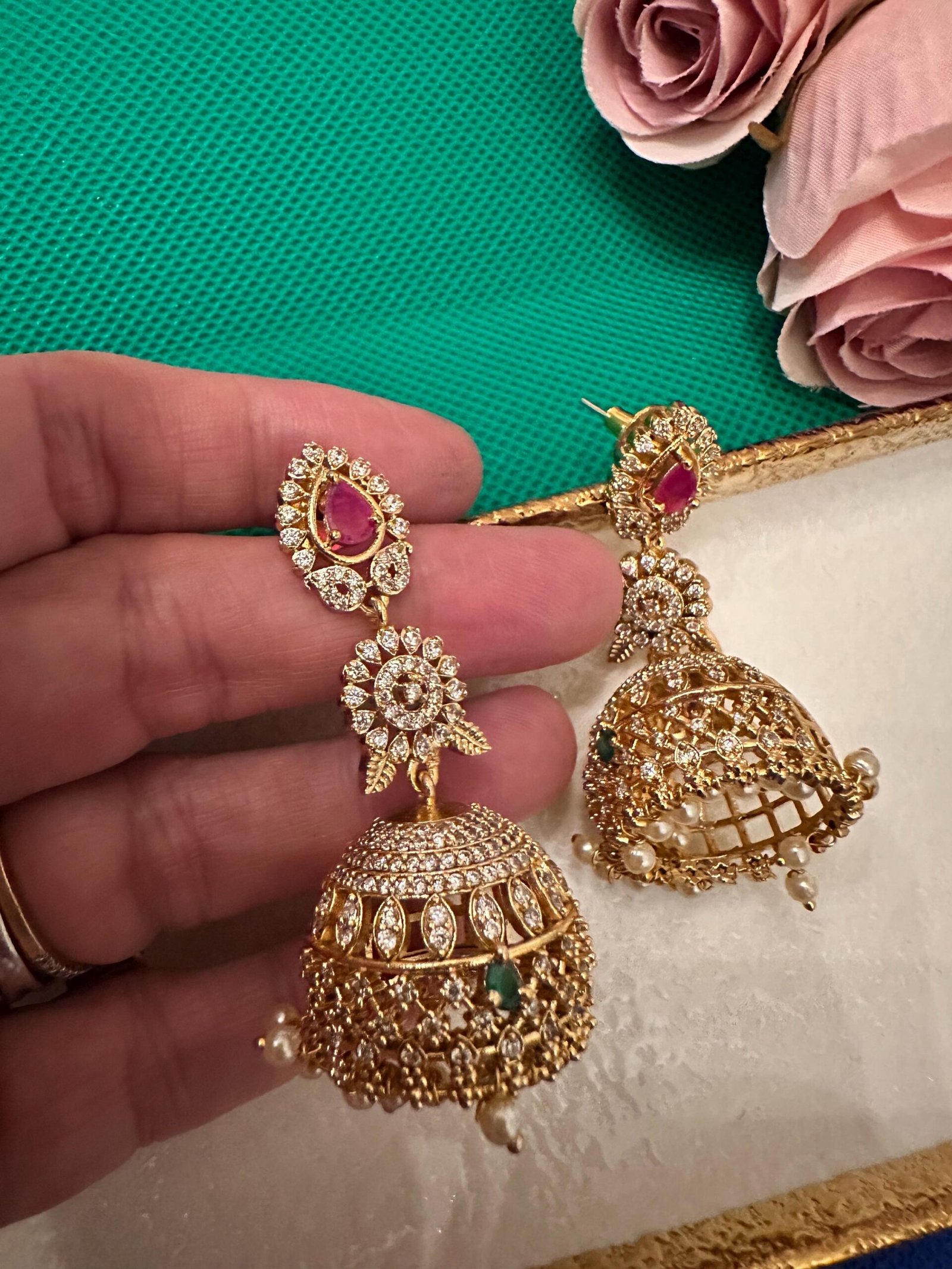 Bollywood Indian Designer Earrings jhumki in ad ruby and emerald green stones.