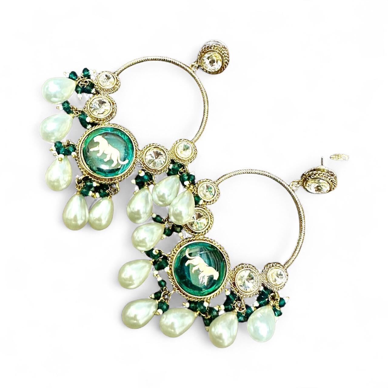 Bollywood Sabyasachi inspired Indian Designer statement dangling Earrings , antique gold finish Green emerald with Ad stones FREE SHIPP