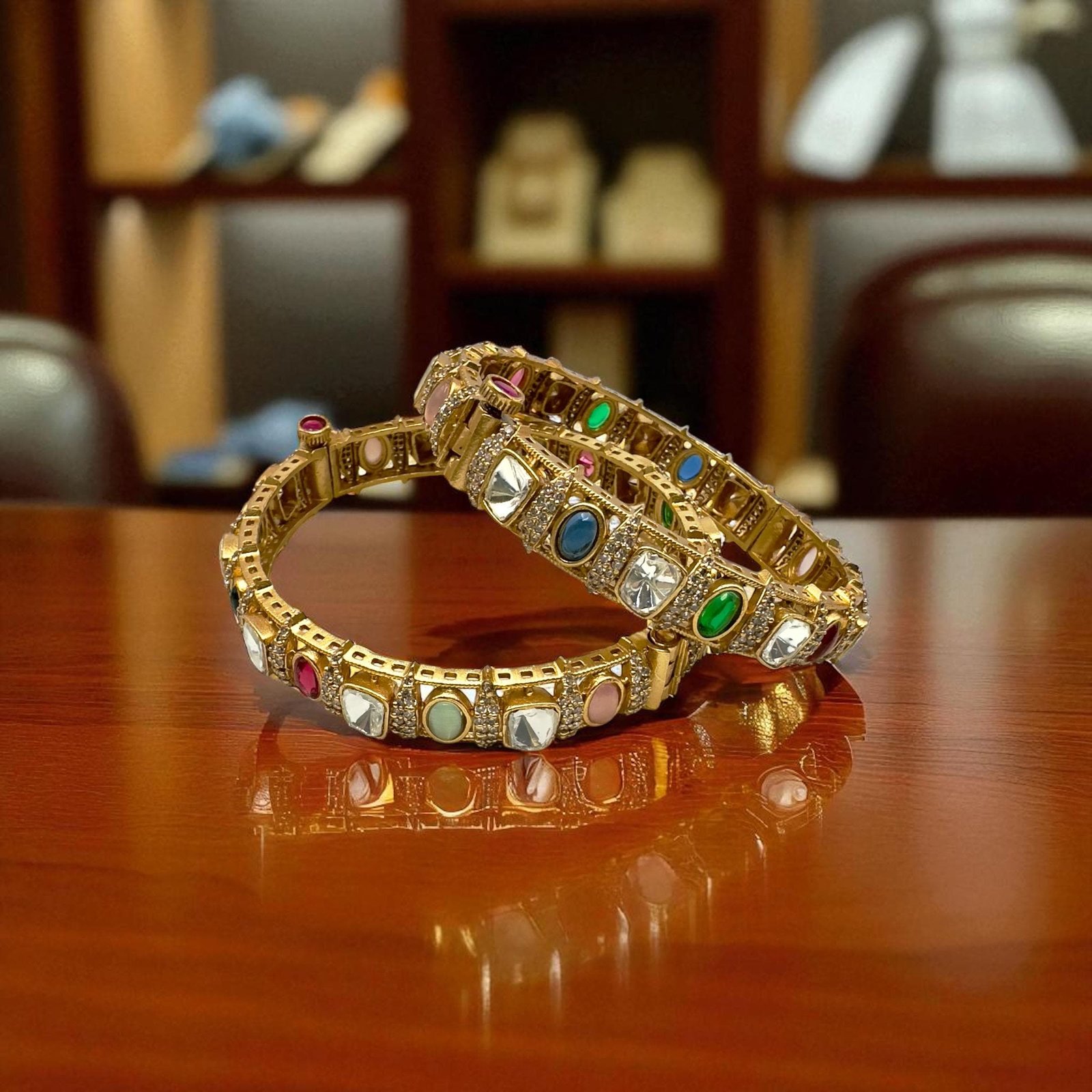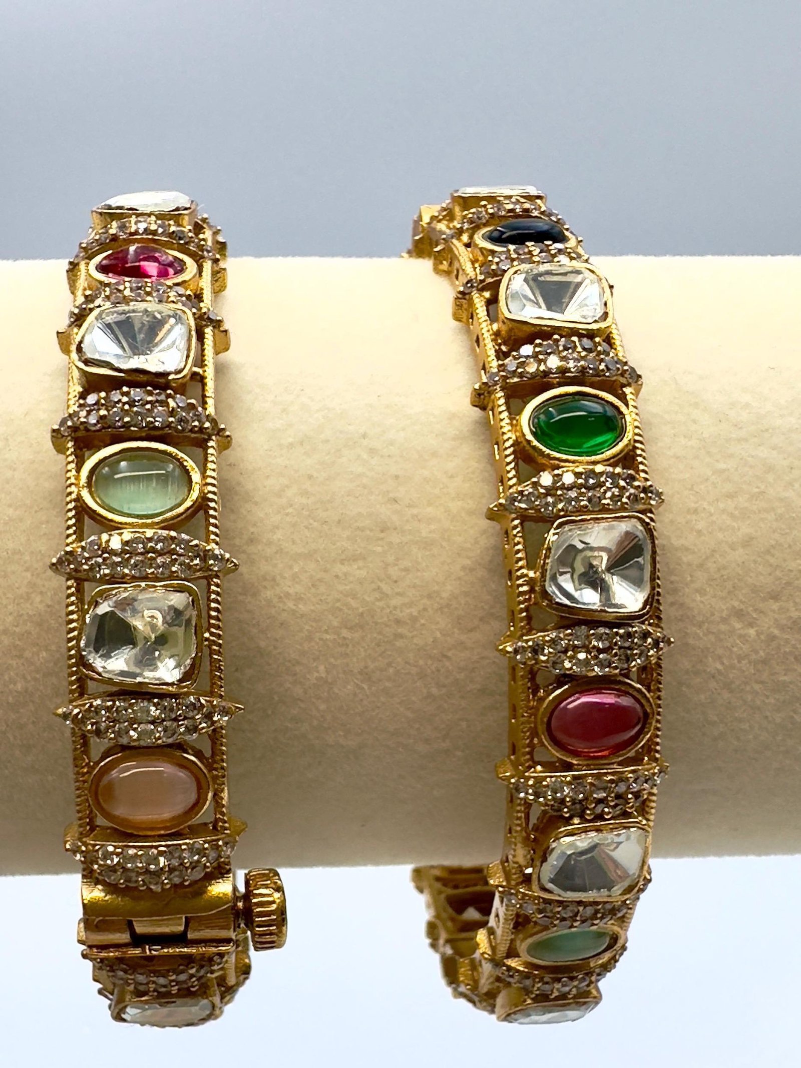 Designer Bollywood openable Kada set Gold Finish. Indian Gold Plated Bangle with Ruby and Emerald multi semi precious stones 2.4 & 2.6 size