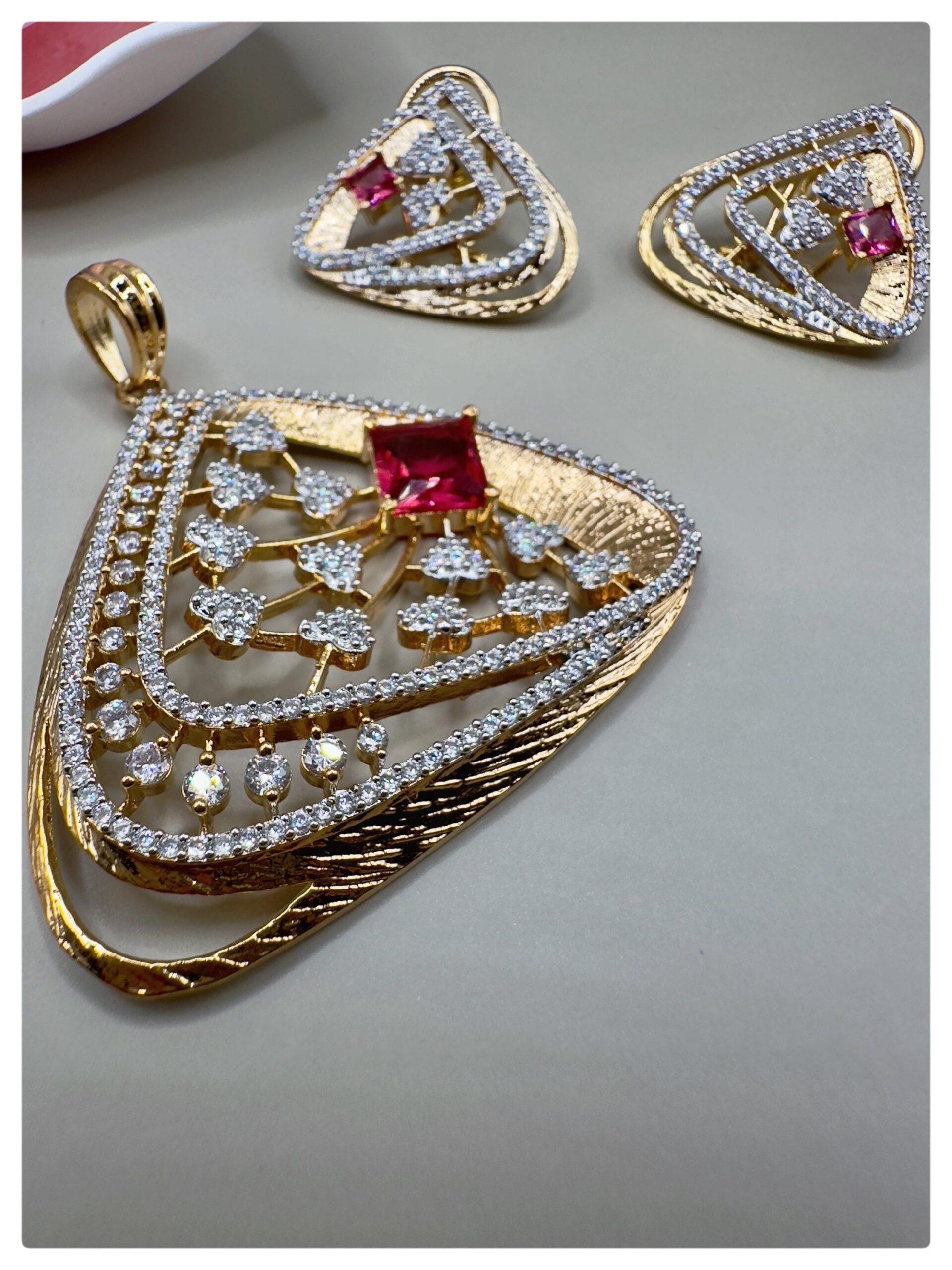 Elegant Gold-Plated Pendant Necklace & Earring Set,Ruby and cubic zarconia