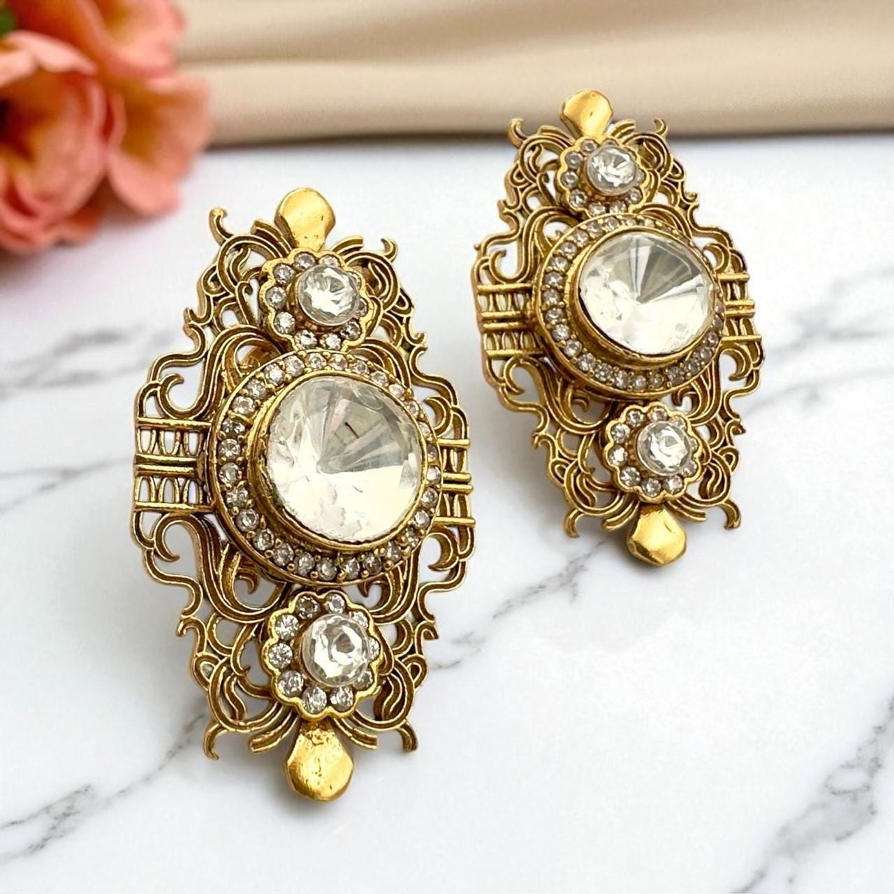 Elegant Gold-Plated Polki Earrings with Clear Stones – Traditional Indian Jewelry for Weddings and Festivals