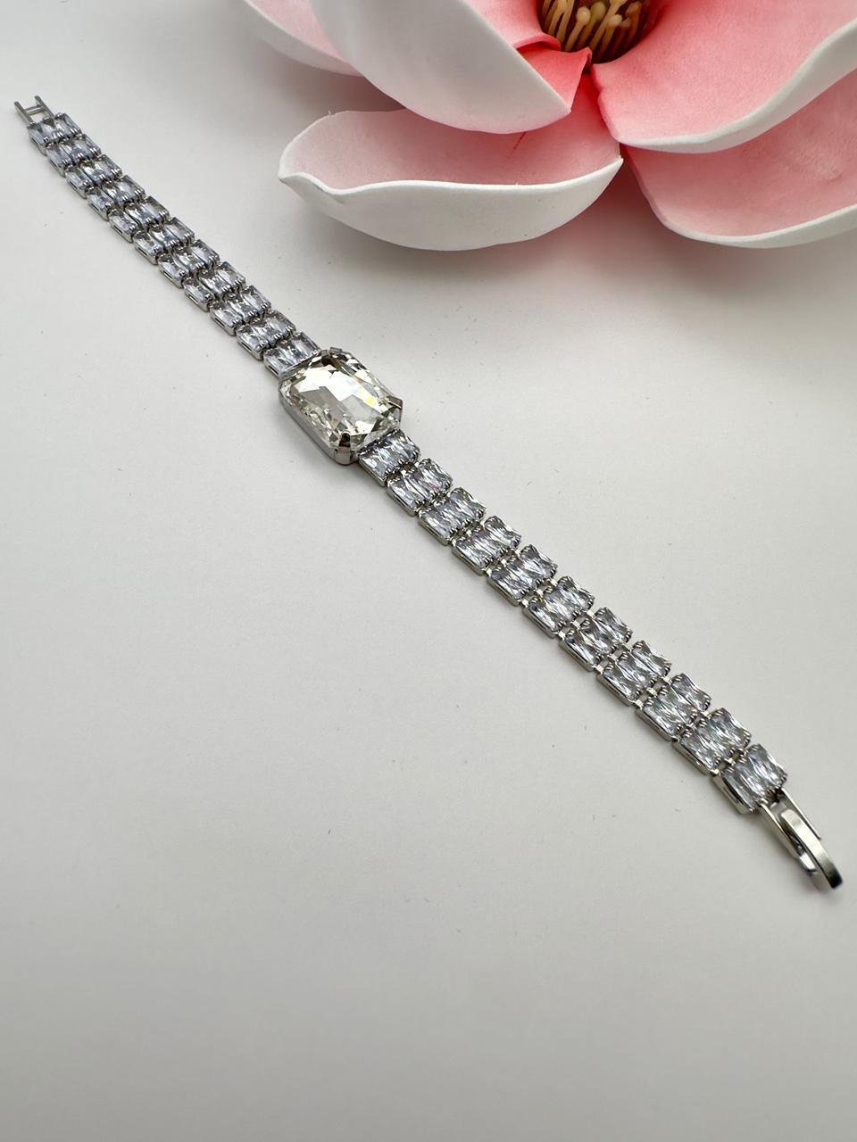 Emerald Cut Crystal Tennis Bracelet with Large Center Stone – Silver Tone Luxury Jewelry for Women