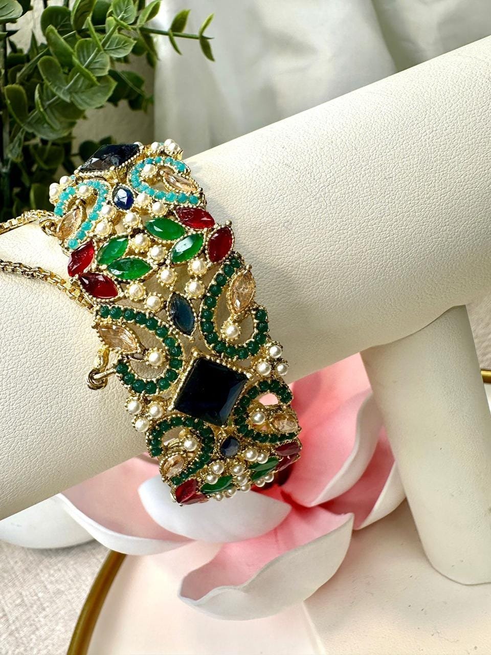 Exquisite Gold-Toned Kundan Cuff Bangle with Multicolor Stones & Pearls – Indian Traditional Jewelry