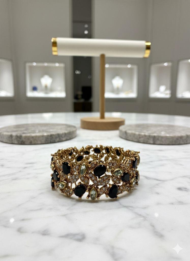 Gold Black Stone Bracelet | Luxury Kundan Kada | Handmade Crystal Bangle | Statement Bridal Jewelry | Elegant Party Bracelet for Women