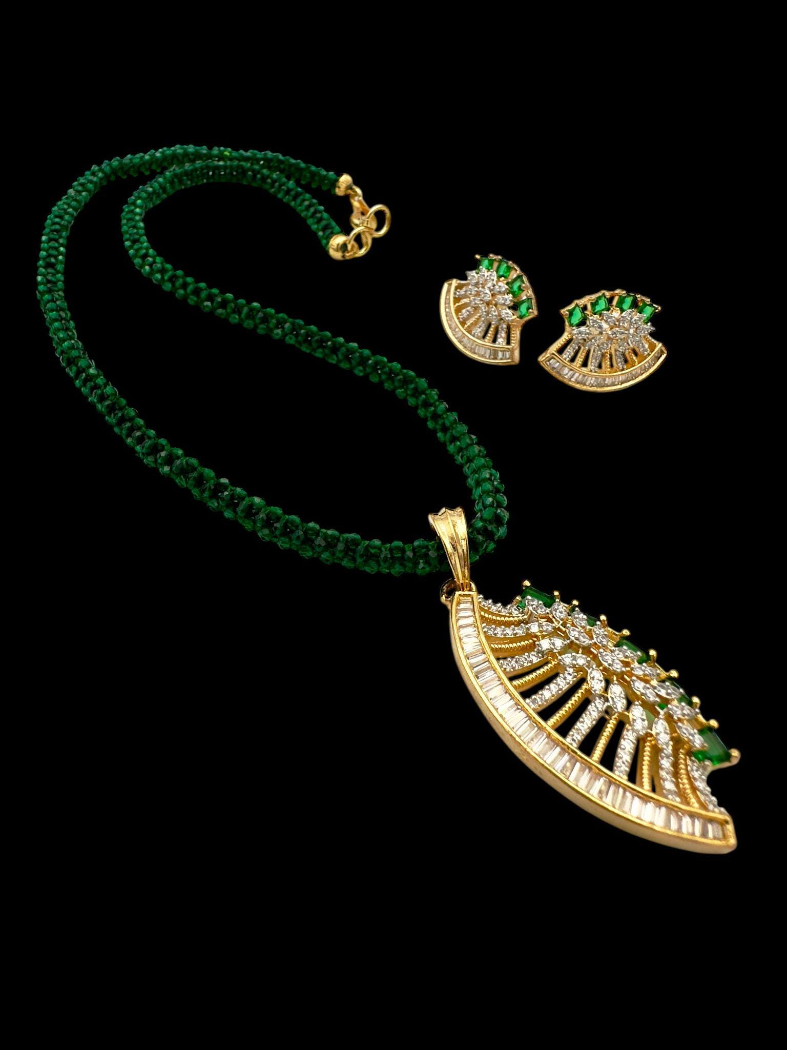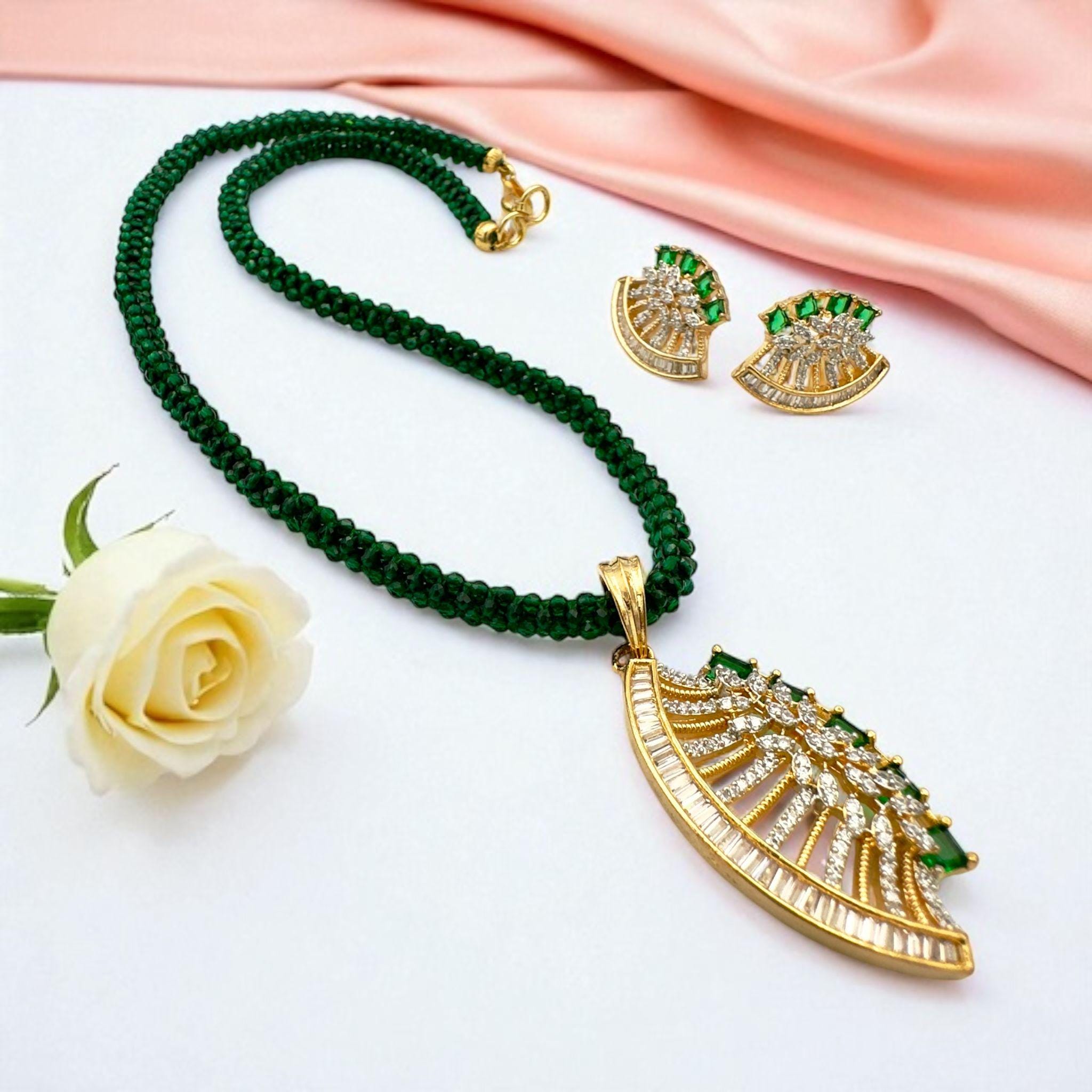 Luxury Emerald Green Beaded Necklace with Gold Pendant and Earrings Set – Traditional Pakistani Jewelry