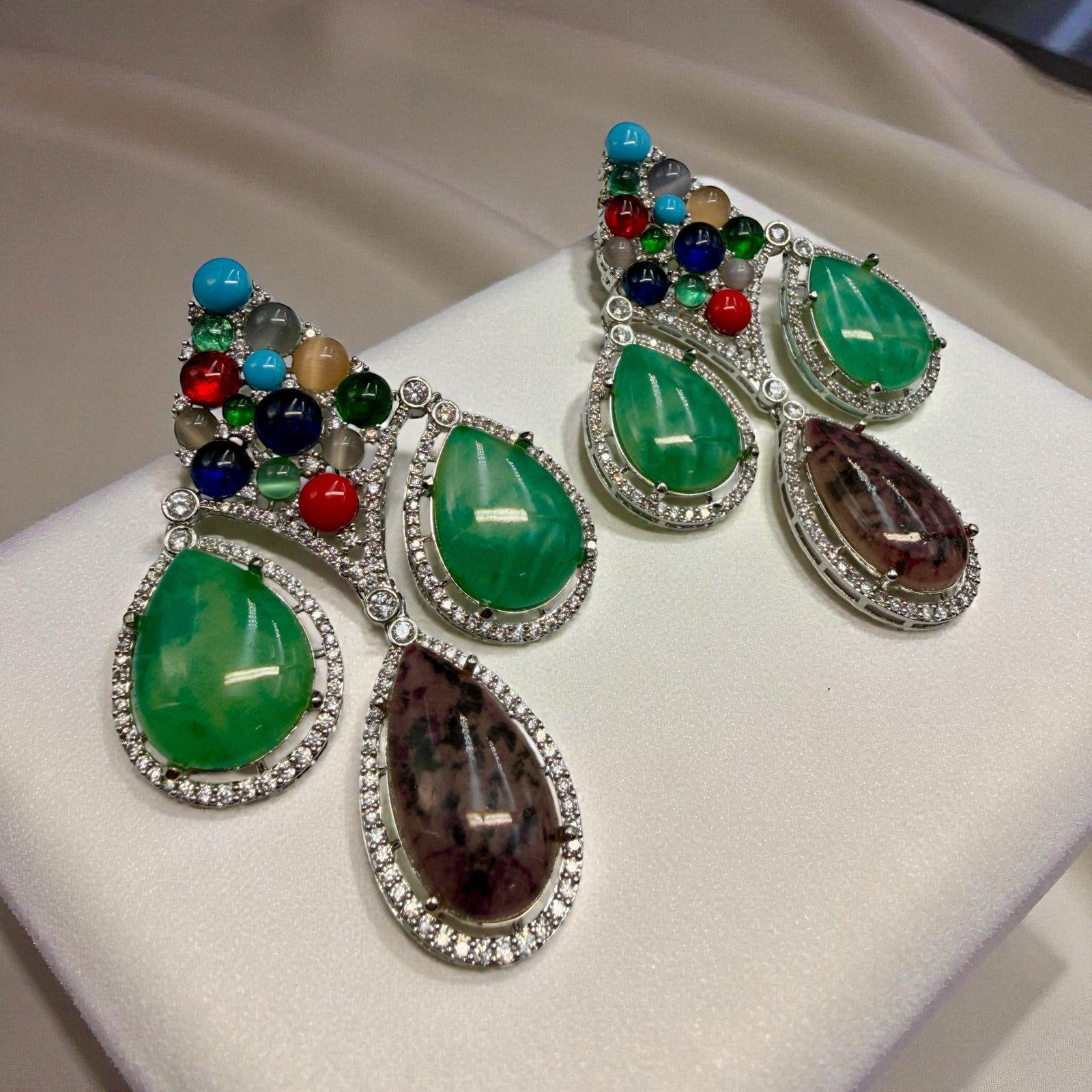 Multicolor Gemstone Drop Earrings | Green Stone Dangle Earrings | Statement Silver Plated Jewelry