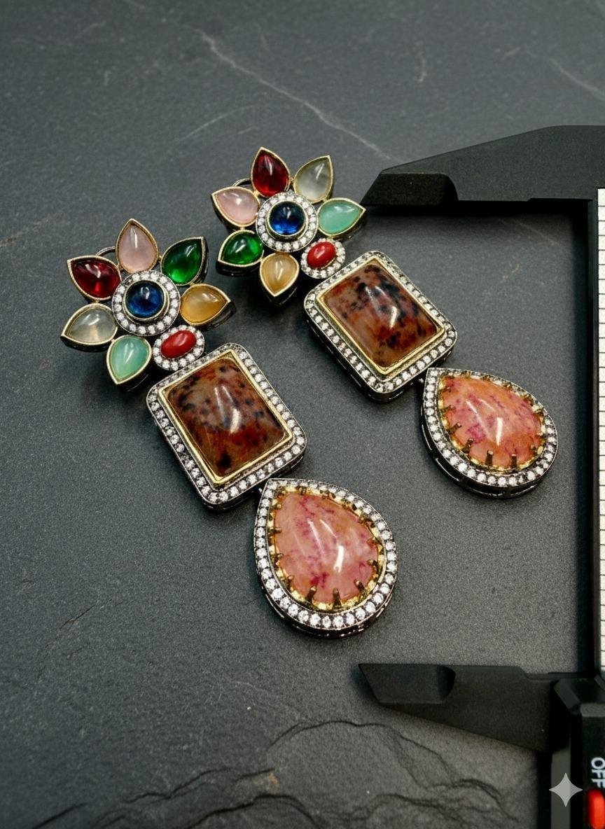 Multicolor Gemstone Statement Earrings | Navratna Style Gold Plated Jewelry | Luxury Bridal & Festive Earrings | Designer Ethnic Dangler
