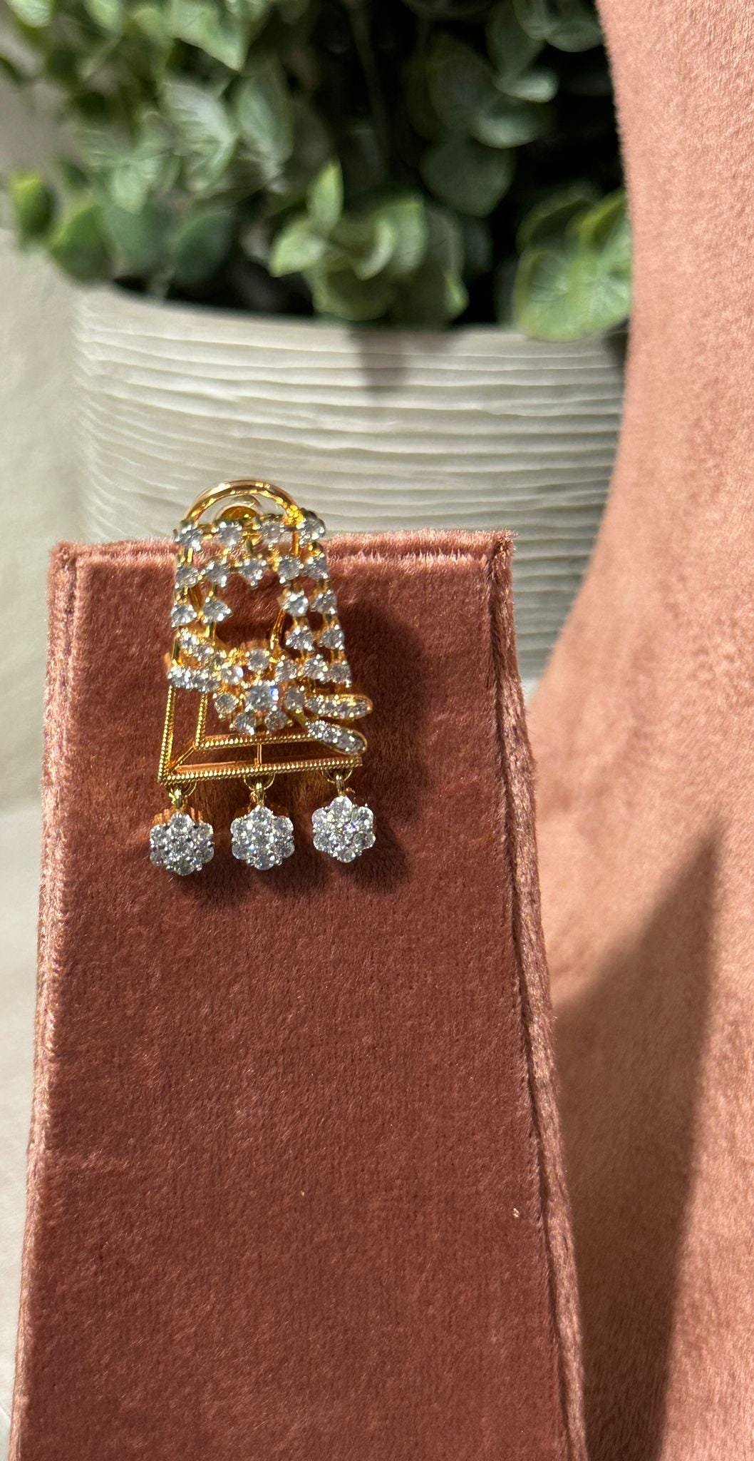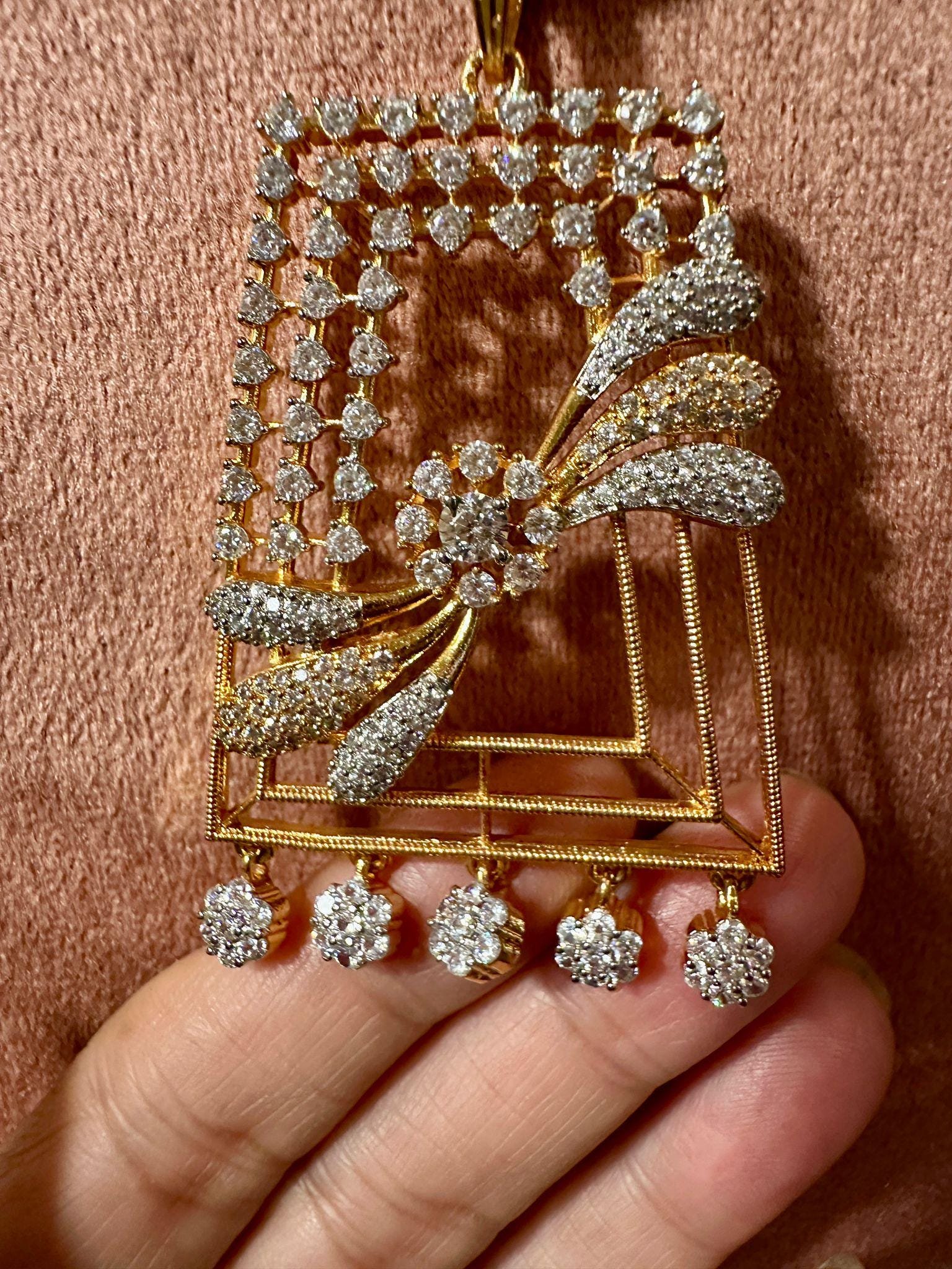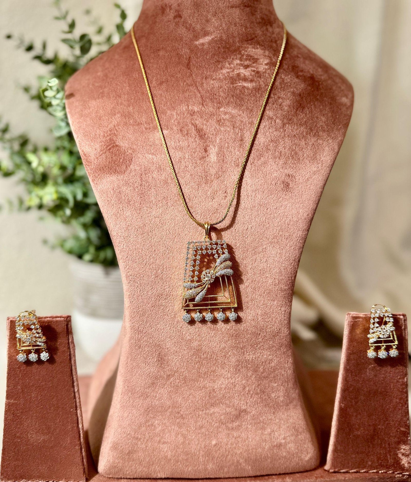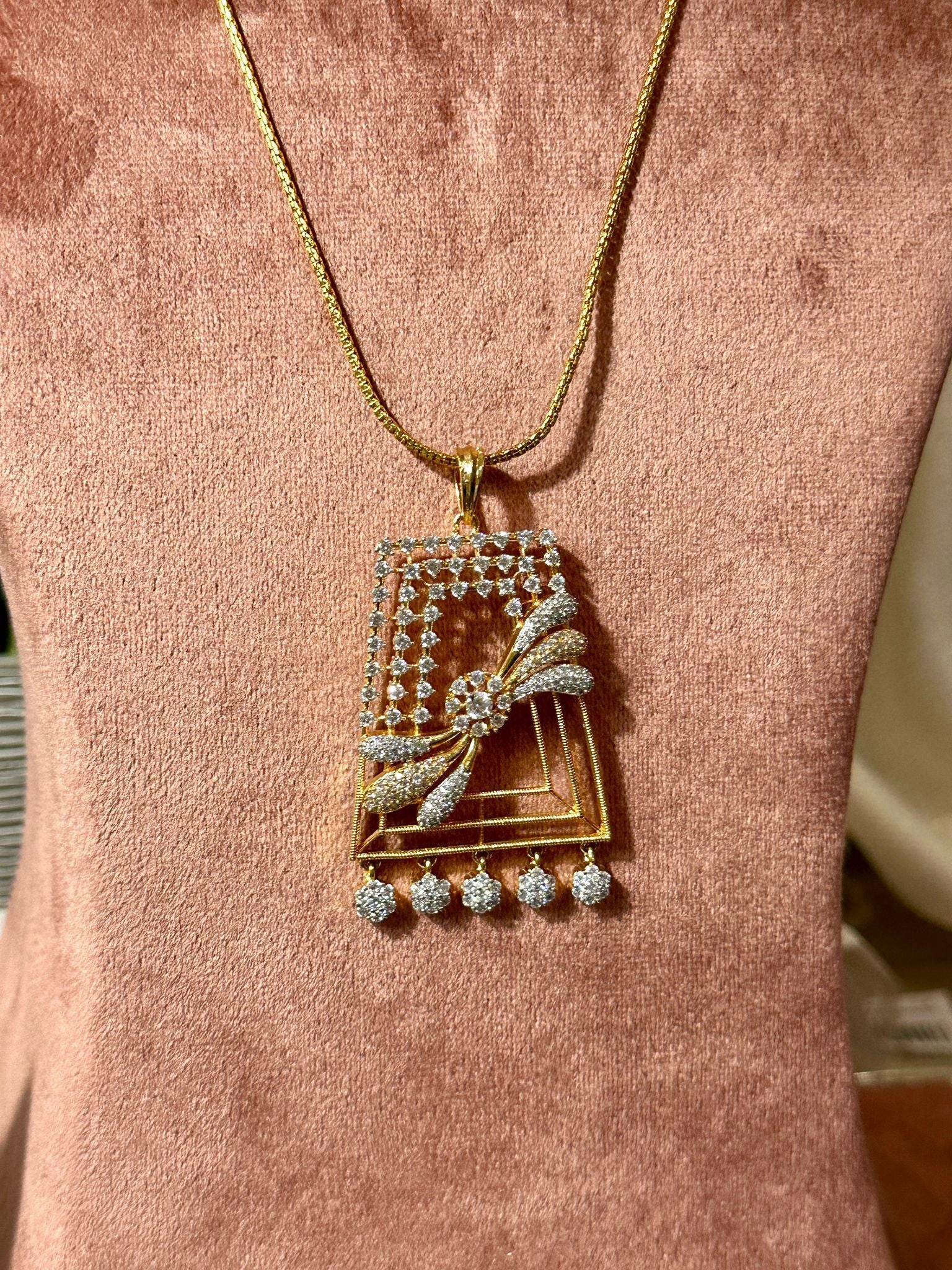 Rectangle Gold Pendant Set with Floral Diamond Accents ? Necklace & Earrings Desi Set Unique Pendant Set, Indian pendant set, Gold chain