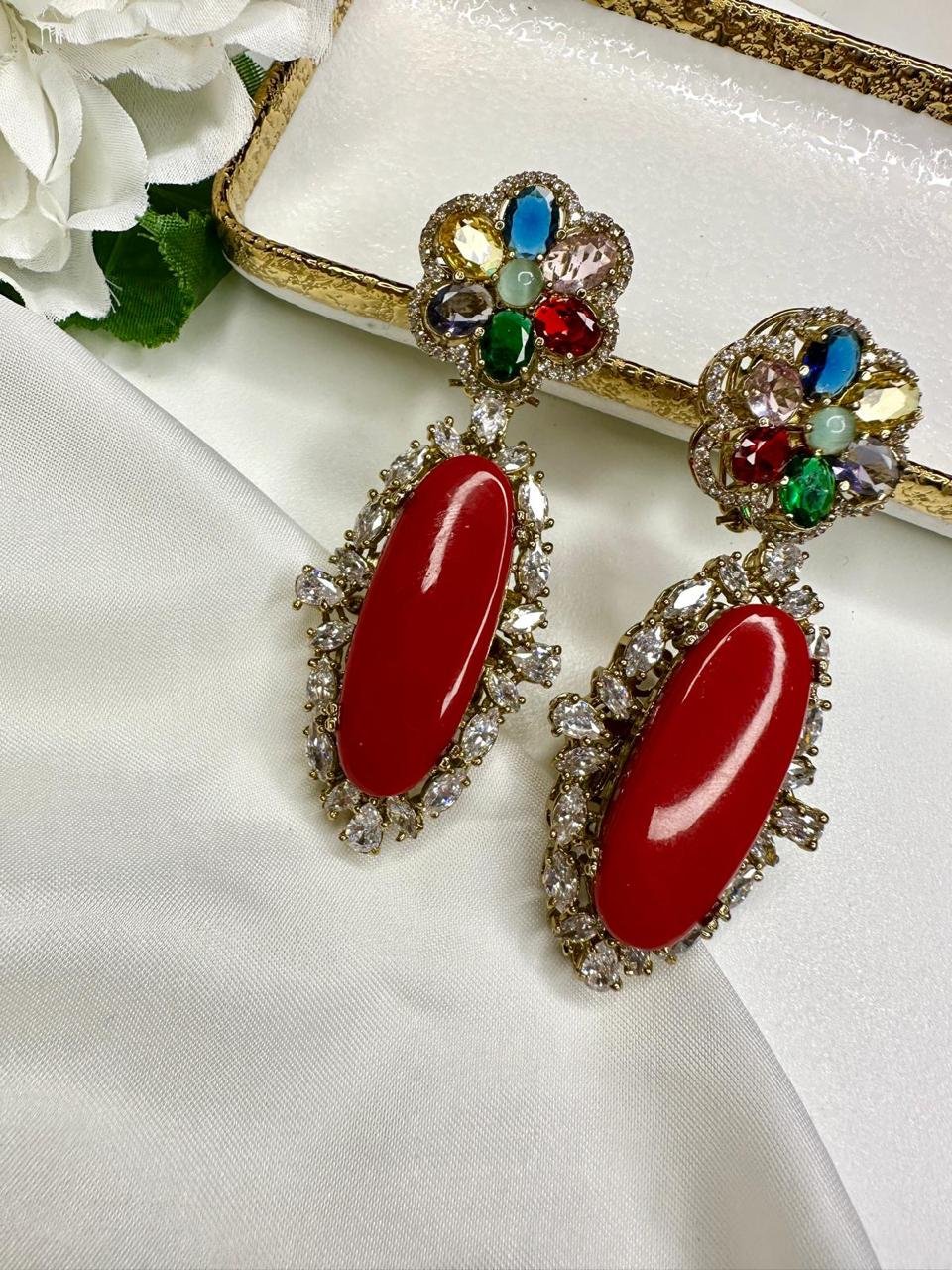 Red Oval Stone Flower Earrings with Multicolor Gemstones – Gold Tone Dangle Earrings
