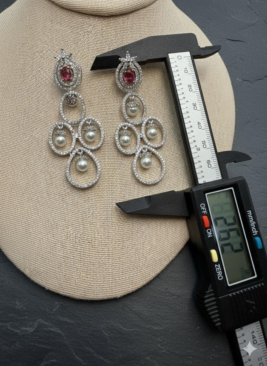 Silver CZ Pearl Drop Earrings | Ruby Crystal Bridal Dangler Earrings | Luxury Wedding Jewelry | Elegant Statement Earrings for Women